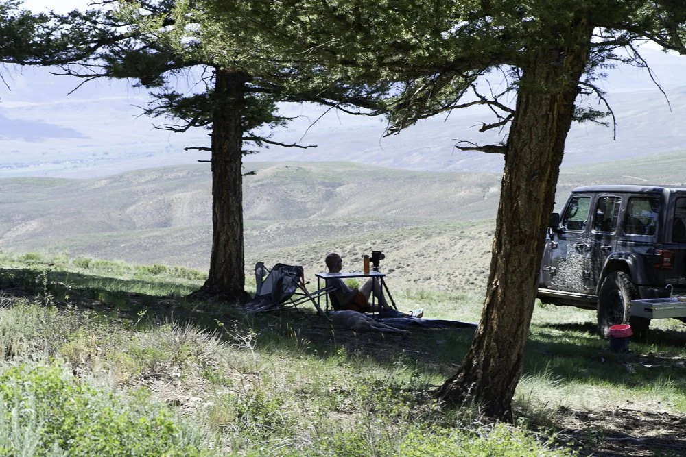 With the portable ham radio in hand, I got out of the Jeep and started walking uphill. It was a hot, long, steep walk. At the top of the hill I found a broken up fire ring. Other people had camped here. The trees would provide us with shade and there was plenty of room to turn the trailer around. But the area was sloped and I was not sure we could level the trailer. I called on the radio and said come up the hill. Then I noticed the view. That morning we had left a pretty mountain camp where we could only see the valley beside our camp. Now we were 1,400 ft lower but had a 14 mile view to the north. It was the best camp site we’ve seen. We easily leveled the trailer by parking the downhill wheel on our jack’s base and adjusted the air bags. Spreading a blanket on the ground under a tree, we sat for hours looking at the view, pointing out features to each other and watching the occasional vehicle roll by, far below us.