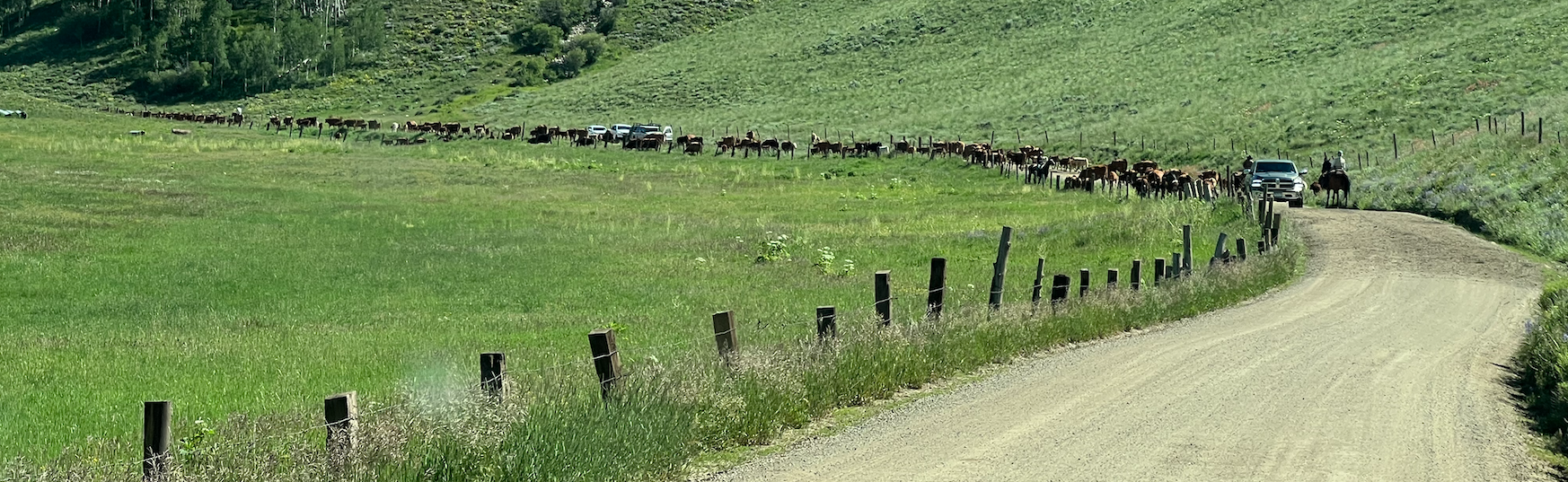 The private property in the valley was a cattle ranch and the cows were being moved to another pasture. We were behind a modern-day cattle drive. It was a bit like what you see on TV except the cows walk down the road with a fence on both sides so it was very organized. The cattle can only move along the road but they still found ways to cause trouble. They bellow, a lot. They stop to have a snack of grass in the ditch. They hide behind cars along the road. And of course they relieve themselves in the road and unfortunately on each other. Yes, we both let out a startled cry when one cow urinated on another cow’s face. Gross! Never walk too close behind a cow. The thing that I had not considered about cattle drives is cows and calves get separated in the confusion. That would account for all the bellowing. It also means the end of the cattle drive is mostly calves that are alone for the long walk.