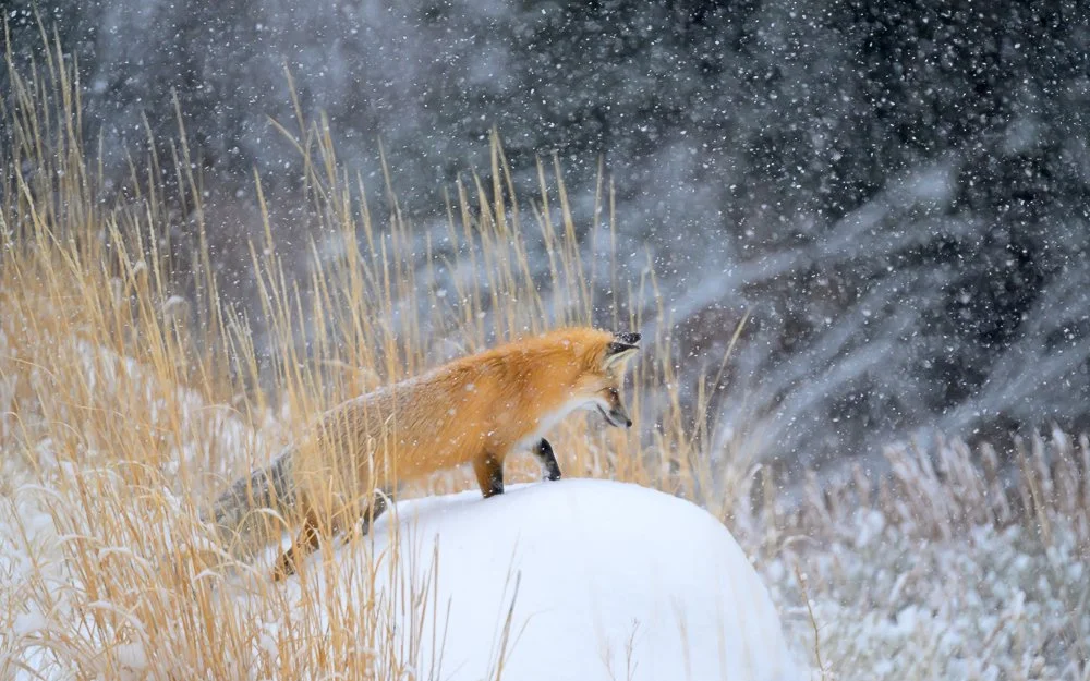 What caught my eye: We were in Yellowstone looking for animals to photograph. This one was hard to spot through the falling snow and grass. His focus on some small rodent was intense, but his meal was delicious.